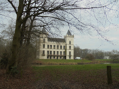 Een smal stuwtje over een stromende sloot langs de Gooyerdijk brengt mij binnen het gebied van Parc Broekhuizen. Een indrukwekkend groot en hoog kasteel met enkele bijgebouwen en een park met een ruime waterpartij. Het huis is tegenwoordig als hotel in gebruik. De routebewijzering leidt je met ruime afstand om de oranjerie heen. De privacy van de gasten moet beschermd worden. |