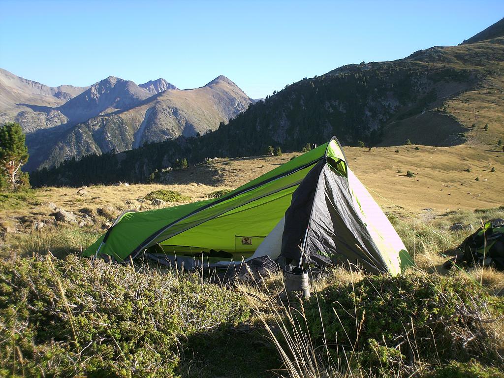 Vlak bij het Chalet is prima gelegenheid voor een bivak. De tent van Adam staat er al. Gisterenavond aan de bar in Las Illas was onze gezamenlijke moeite met het kuddegedrag van kampeerders om, in een zee van ruimte, tenten vlak naast elkaar te zetten, een van onze thema's geweest. We zagen er zelfs de mogelijkheid in voor een wetenschappelijk onderzoek. Ik zet daarom mijn tent wat verder weg en wat hoger in de luwte van struiken. Daarna ga ik voor € 2 douchen in de gite en kan ik in die douche ook nog gauw mijn was doen.
